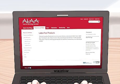 Find products to replace those that contain latex. Because so many products contain latex, you'll want to find other products with which to replace them. Thankfully, there are many latex free products that you can switch to, allowing you to avoid future allergic reactions. Take a look at some of these examples to get an idea of which products you can replace with latex free alternatives: Vinyl gloves can be a good replacement for gloves that contain latex. Use condoms made from polyurethane or polyisoprene instead of latex. You can try using cotton based bandages instead of ones that may contain latex. Try to shop for clothing that is elastic free, as elastic usually contains latex.