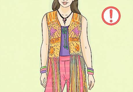 Don't go overboard. With all the patterns and layers available, building a Boho Chic outfit can be daunting. Avoid the temptation to wear all of your favourite things at once. You'll also want to avoid being too colourful: aim for mostly neutral tones plus one or two accent colors. It's also important to consider textures. Wearing patterned pants with a lace top and a crocheted fringe vest would definitely be going overboard. Similarly If you're wearing a beaded top, it may be overkill to wear a bunch of beaded necklaces with it. If you're unsure of what sort of color combinations to use, an online search for “Boho Chic color combinations” will return a lot of creative suggestions.