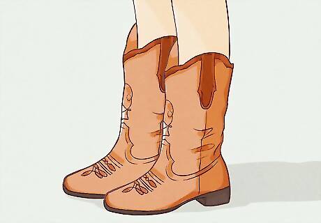 Wear shoes in natural shades and fabrics. Ballet flats and ethnic-inspired sandals (i.e. Greek, Roman, or African) are the generally accepted staples of Boho Chic. For cooler weather, you can wear cowboy boots, ankle boots with thick heels, or high '70s-inspired boots. Leather and suede are the preferred fabrics for shoes; natural shades such as beige, tan, and brown are recommended. If you're vegan, it's possible to buy convincing vegan “leather” versions of natural leather shoes.