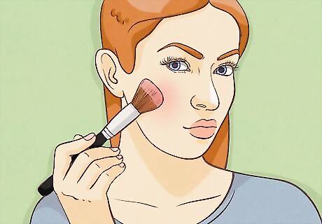 Apply blush to your cheeks. Once your face looks clear, add some light blush to your cheeks. Smile and apply a light dusting of blush from the apples of your cheeks outwards, following the natural curve of your cheek. When applying blush, think youthful radiance, not post-intense workout. A little bit of blush along the bridge of your nose will help give you a sun-kissed look — just don't go overboard lest you wind up looking sick, with a red nose. If you're tanned or have dark skin, you can use a bronzer instead of blush.