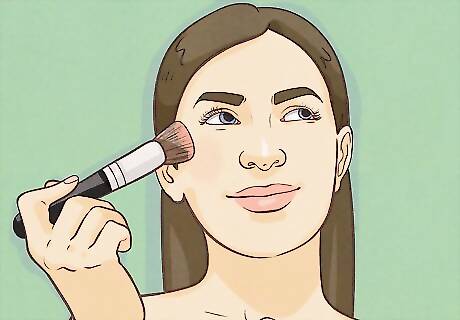 Ensure that your skin looks even and unblemished. If you have perfect skin, lucky you! If you're like the rest of us, you'll want to put some concealer on any breakouts, and perhaps even put a foundation on your whole face. If your skin is pretty smooth, with only some light redness, try a tinted moisturizer, BB cream or CC cream instead of a full foundation. This will help even out your skin without being too thick or cakey. If your face is shiny, apply a light powder foundation. Do it with a brush instead of the applicator to help it spread more evenly.