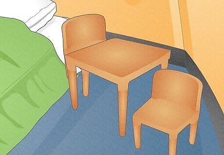 Place a chair, and mini table inside your tent. If you're in a large tent, the kind you can walk around in and that has several rooms, be sure to set up ample "real living space", just like at home. Include a pantry (these can hang or can be formed as little cupboards) and fill with food, but only if you're away from bear country. Otherwise, keep your food in the car or locked away in provided lockers. Place cushions on the chairs and a rug or two on the tent floor. Skip this step if you don't have enough room in your tent.