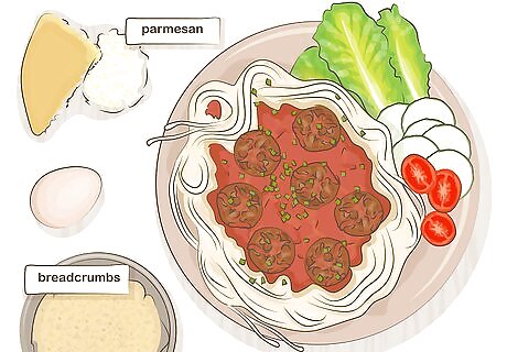 Prepare spaghetti, meatballs, and a side salad for a fantastic dinner. Fill a large pot about halfway full with water and bring the water to a boil. When the water boils, place about 1/4 cup (50 g) of spaghetti per person in the water. Let the noodles cook for 8-12 minutes or until they are soft all the way through. As the noodles cook, mix together 1 lb (454 g) of meat, 1 egg, 1 cup (237 g) of breadcrumbs, 1/2 cup (118 g) of grated Parmesan, and 1 tsp (5 g) of salt. Then, form 1 in (2.5 cm) balls by rolling the meat in your hand. Warm up 2 tbsp (30 mL) of olive oil in a medium saucepan, and cook the meatballs for 10 minutes or until they are completely brown. In addition to spaghetti and meatballs, chop up some romaine lettuce, add in some cherry tomatoes, and slice a cucumber to make your own side salad. Serve this with a dressing of your choice to pair along with your spaghetti. Serve your spaghetti and meatballs with marinara sauce. You can also make garlic bread for an additional side.