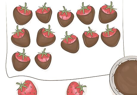 Cover strawberries in chocolate for a delicious, fruity dessert. Select 1-2 packages of fresh strawberries, and wash them with cool water to remove dirt and debris. Pat the strawberries dry with a clean towel and melt chocolate using a double boiler or your microwave. Once the chocolate is melted, dip individual strawberries into it and cover each side. Lay the strawberry on a piece of parchment paper so the chocolate can harden. Refrigerate your strawberries for at least 30 minutes before serving.