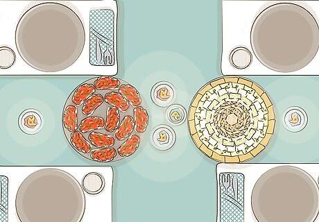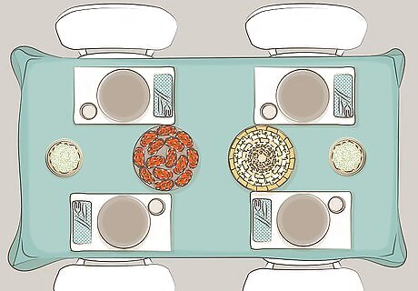 Set the table before your guests arrive. Lay down a tablecloth, put 1 placemat on the table per guest, and set a decorative plate on top. Don’t forget to set your silverware and place a water cup on the table. If you have them, fold cloth napkins for a cute, sophisticated touch. Serve your food buffet-style if you have many guests, or place the food on your dinner table for an intimate gathering.