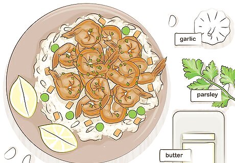 Make garlic butter shrimp for a tasty seafood option. Mix 2 lbs (907 g) of large peeled, deveined shrimp with 2 tbsp (30 mL) of olive oil, 2 minced cloves of garlic, 1 tsp (5 g) of salt, and 1 tsp (5 g) of black pepper. Roast your ingredients at 350 °F (177 °C) for 6-8 minutes. Pour 4 tbsp (60 g) of unsalted butter on top of the shrimp while they are on the baking sheet. To serve the shrimp, transfer them into a serving dish and garnish the dish with a sprinkling of fresh chopped parsley. Serve your buttered shrimp with lemon wedges for taste. Pair your shrimp with side dishes such as rice pilaf, asparagus, and garlic bread.