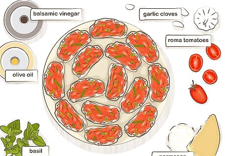 Serve bruschetta with a baguette for an easy, light option. Mix together 2 1/2 cups (592 g) of minced Roma tomatoes, 2 tbsp (30 g) of minced garlic, 1/3 cup (79 g) of chopped fresh basil, 2 tbsp (30 g) of balsamic vinegar, 3 tbsp (45 g) of extra-virgin olive oil, 1/4 cup (59 g) of grated Parmesan cheese, 1 tsp (5 g) of salt, and 1 tsp (5 g) of pepper. Let the bowl sit for 15 minutes so the flavors can combine. To serve the bruschetta, slice a baguette into 1 inch (2.5 cm) thick pieces and place 1 spoonful of bruschetta onto each slice of bread.