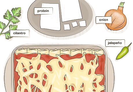 Choose enchiladas for a flavorful Spanish option. Cook 3 cups (709 g) of protein with 1 cup (237 mL) of enchilada sauce, and mix in 1/2 cup (118 g) of chopped onion, 1/4 cup (59 g) of cilantro, and 1/2 cup (118 g) of sliced jalapeño. Cook these ingredients all together in a saucepan on medium-high heat for about 5 minutes. Then, stuff each tortilla halfway full of your ingredients. Wrap up the tortilla and place it inside a baking pan. Fill the baking pan with stuffed tortillas, pour 2 cups (473 mL) of enchilada sauce over the tortillas, and cook them for 10-20 minutes at 350 °F (177 °C). Select a protein of your choice, such as chicken, steak, shrimp, or tofu. Serve your enchiladas with Spanish rice and refried beans if you’d like.