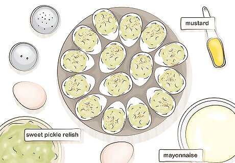 Prepare deviled eggs for a quick but exquisite dish. Place the eggs in a single layer inside your pot, and cover them with 3 inches (7.6 cm) of water. Select a medium-high heat, and bring the water to a boil. When the water boils, cover the pot and remove it from the heat. Let the eggs sit for 15 minutes, drain the water, and let them cool. Then, crack the shells and peel the eggs while holding them under running water. Next, slice each egg in half horizontally and take out the yellow yolks. To make your filling, mash the yolk with 2 tbsp (30 g) of mayonnaise, and mix in 1 1/2 tbsp (22 g) of sweet pickle relish, 1 tsp (5 g) of mustard, and a dash of salt and pepper. When these ingredients are mixed into a creamy paste, fill each half with 1 spoonful. You can sprinkle paprika onto the eggs for a garnish if you’d like. Place the sliced eggs on a serving tray and pass them out to your guests with cocktail napkins.
