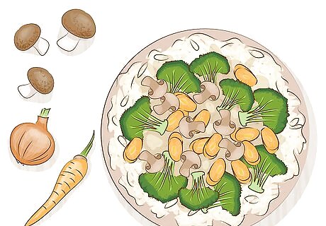Stir-fry vegetables for an Asian-inspired dish. Choose 2-3 cups (473-709 g) of nearly any vegetable you’d like to use in your stir-fry, such as carrots, broccoli, cabbage, snap peas, mushrooms, and onions. Chop up your veggies into bite-sized pieces, and heat them in a medium saute pan for 5 or so minutes. Mix in 1 cup (237 mL) of soy sauce once the veggies are cooked. Serve your vegetables over rice or noodles. Add cooked shrimp, steak, or chicken if you want to include some protein with your dish. If you want a different sauce option, combine 1/2 cup (118 mL) of soy sauce, 1/4 cup (59 mL) of water, 1 tbsp (30 mL) of rice wine, and 2 tbsp (30 g) of brown sugar to make your own teriyaki sauce.