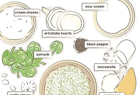 Make spinach and artichoke dip for a warm, creamy first course. Mix together 1/2 cup (118 mL) of fat-free sour cream, 1/4 tsp (1 g) of ground black pepper, 3 minced garlic cloves, 1 3/4 cup (414 g) of artichoke hearts, 1 1/4 cup (296 g) of spinach, and 1 cup (237 g) of cream cheese. When these ingredients are well blended, add in 1 cup (237 g) of mozzarella and 2 tbsp (30 g) of Parmesan. Scoop the mixture into a baking pan, and cook it for 30 minutes at 350 °F (177 °C). Serve the dip with crackers, sliced bread, or pita chips.