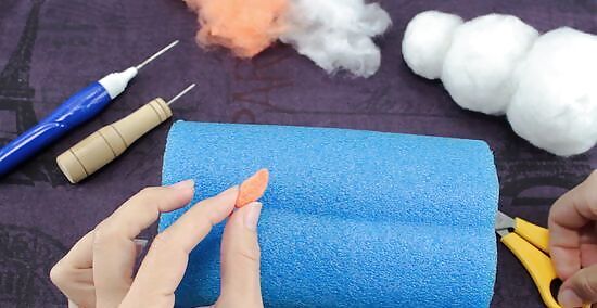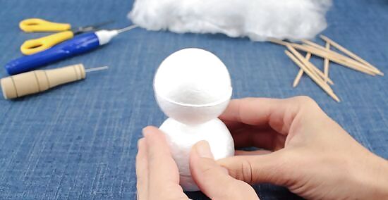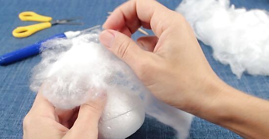 Wrap a piece of wool roving around the snowman, then poke it into the Styrofoam balls using a felting needle. Pull a tuft of wool roving, and wrap it around the Styrofoam. Poke your felting needle up and down against it and into the Styrofoam ball. Keep doing this in various places until the wool stick. When you get to the seam between the two balls, wrap a tuft of wool around the neck, then poke the needle into the balls themselves, and not the space between them. Use as many tufts and layers of wool roving as you need to in order to cover up the Styrofoam.