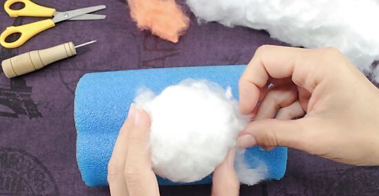 Poke the ball with a size 36 felting needle until it holds its shape. Hold the loose end in place as you poke the ball with the felting needle. Keep poking the wool until a firm ball starts to form.