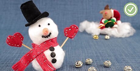 Glue small, black gems to the snowman to make the eyes and buttons. Get a sheet of small, black, self-adhesive gems from the scrapbooking section of your arts and crafts store. Attach two gems to the small ball using hot glue to make the eyes. Attach three gems to the bigger ball to make the buttons. If you can't find any hot glue, use fabric glue or tacky glue instead. Don't rely on the adhesive that's already on the back of the gems; it's not strong enough. If you'd like, you can attach four to five gems to the small ball to make the mouth. Can't find any black gems? Try black, mini, doll-sized buttons instead.
