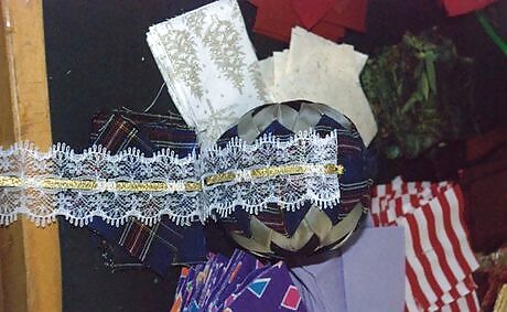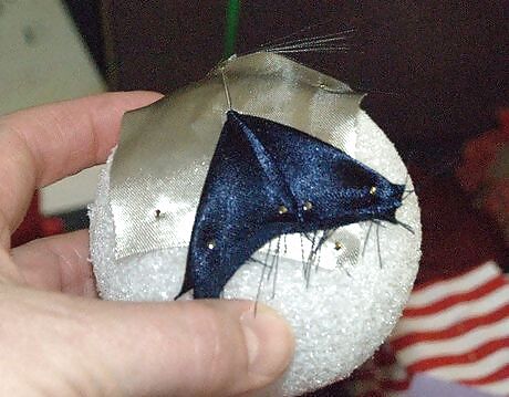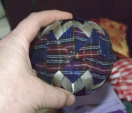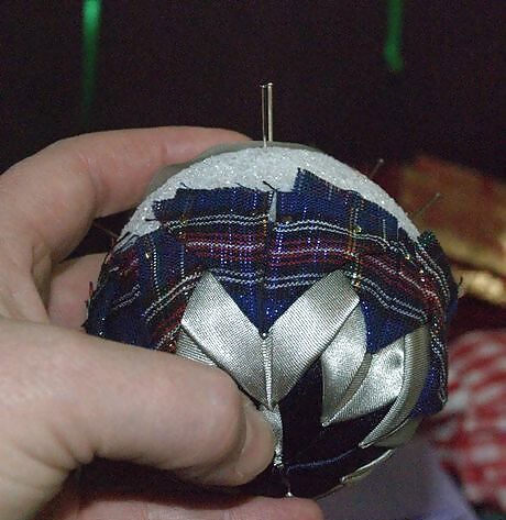 The ball should be totally covered by now, with a row of raw edges. The poles will appear as a "country star".