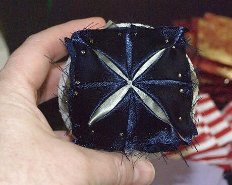 Repeat this pin and fold action many more times, for a total of three rows per hemisphere as follows: FFS 9_row_1_complete_49.jpg4 points touching the pole. FFS 11a_531.jpg FFS 11b_804.jpg FFS 11c_row_2_complete_624.jpg8 points in the next row, spacing the tips of the points approximately half an inch (1.27cm) below the pole, and lining the points up with the points above and the folded edges and lines with the row above. Check your measurement to see if three rows will reach the center meridian or not. Widen the distance between rows if necessary. FFS 13 _row_3_complete_548.jpg8 points in the third row should bring your raw edges to the equator. After three rows, if you have not reached the equator of the ball with the raw edges of your folded points, you will need to unpin and repin the rows with more or less spacing to compensate.