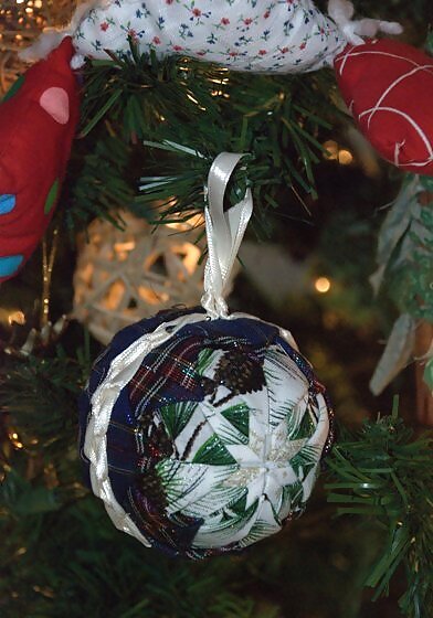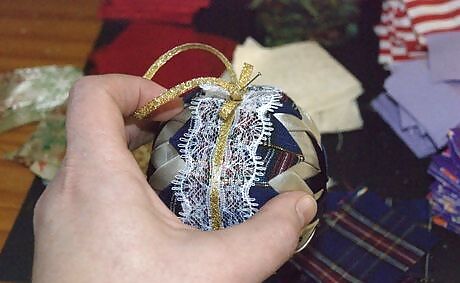 Pin and/or glue a loop of ribbon to allow you to attach the ornament to your Christmas tree.