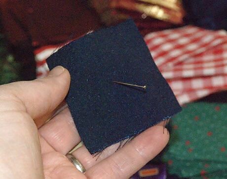 Pin the bottom edge of the triangle with 4 pins. Use one for each end of the raw cloth edges.