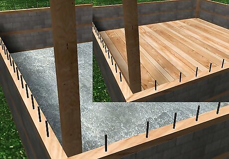 Nail the tarp or beams to the wall tops (you may want to put log braces standing on end with cross-braces to angle the tarp so water doesn't "pond/pool" in the sagging tarp. If using a ridge beam, nail each rafter part of the triangle and nail the planks on top of the rafter beams.