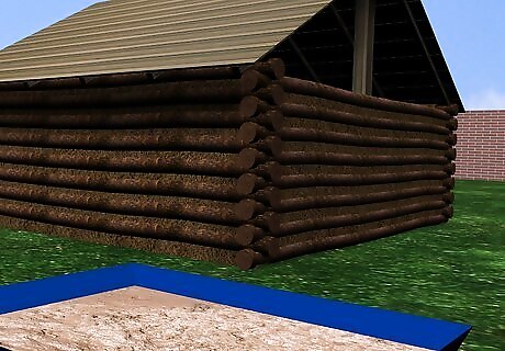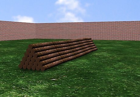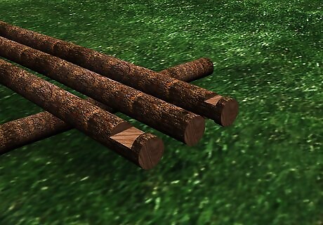 Gather large (about 8 or 10 inches diameter), straight, matching logs/poles. It would be advisable to disinfect the logs thoroughly with diluted 30% household bleach and water (you can mix 1 gallon of bleach into 2 1/3 gallons of water, making 3 1/3 gallons of the mix, for 30% bleach and 70% for the water mixture). Use good, solid wood not containing bore worms, wood ants and such -- and not beginning to deteriorate in storage -- due to moisture/rot, fungus/mold or insects.Make a Log Cabin for Kids Step 1.jpg