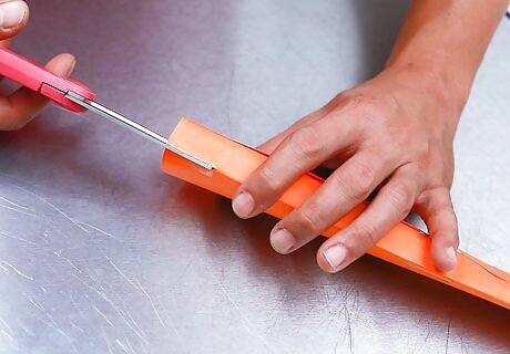 Cut 1” slits in one end. With a pair of scissors, take one end of the flattened handle and cut a 1” slit down the crease where you flattened it. The two slits should be exactly across from one another in a straight line that is parallel to the flat side of the handle.
