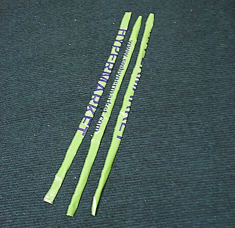Cut out the middle section of the plastic bag. (This part is often where it says the store name or logo.) Cut three strips that are equal to each other in size but make them thick, so you have a strong bracelet. Be sure not to include the handles. The length is up to you. You can make the strips as long as you would like.CutStrips Step 2.jpg