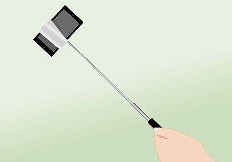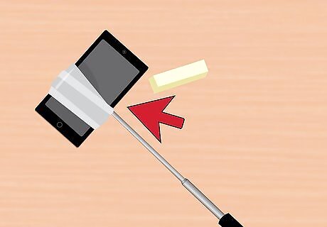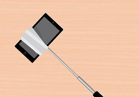 Tape your phone to a stick. For a very quick selfie stick, you can tape your phone directly to a pole or stick. Run tape around the phone and secure it to the stick. Make sure the tape doesn't cross over the camera itself or the phone button. When you're done taking your selfie, carefully undo the tape from the phone and wipe away the adhesive. If you want to improvise selfie sticks, it's helpful to keep a roll of tape on you. It should be noted that a quick selfie stick is not a good idea if your phone is expensive and you're worried about possibly damaging it.