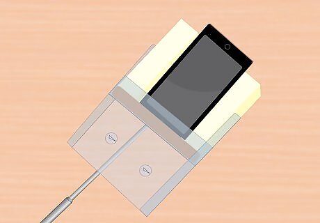 Put your phone between the sponges. If you have given a snug mount of space to squeeze your phone into, your phone should can be secured simply between the sponges. Push apart the sponge foam slightly with your fingers, and slide the phone down in a steady motion.