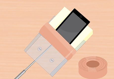 Tape a cassette case onto a flagpole. If you want something truly DIY, scotch tape a flagpole to an empty cassette case. you don't use anymore. Loop two coils of tape around the top and bottom of the case respectively, and wrap them around a flagpole. To create a wedged angle to better aim your camera with, place a length of sponge behind the top of the case and the pole. This will aim the selfie stick downwards, making it easier to catch yourself in the photo. Alternatively, you can buy a specifically made cellphone holder. They are adjustable and will offer you a greater degree of security if you're worried about your phone being damaged. Although cassette cases may be harder to find now than they used to be, you can usually scrounge them up at used music shops or yard sales. Some electronics stores may have them in stock as well.