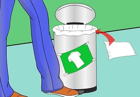 Set up your storage system. Set up an open container for the clean cloths. Choose a second container with a lid for the used cloths. Ideally, use a small trash can that you can open by stepping on a pedal. Line this with a pillowcase so you can easily transfer the cloth to the washing machine. Some people add water and vinegar to the used container to disinfect the cloths. A wet container becomes much smellier and grosser than a dry one, so this is not recommended. This may not even reduce bacteria, since they thrive in moisture. Place a "Cloth only" sign on the used container.