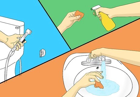 Rinse with a spray bottle. Spray yourself clean with a peri bottle, or any other water-spraying device. You can find a peri bottle in a pharmacy or baby supply aisle.
