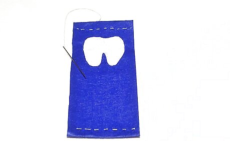Sew tooth down using a needle and white embroidery thread. If you want to use the tooth as a front pocket, sew around the bottom and side edges; leave the top edge open. If you want to use it as an appliqué, sew all the way around the tooth. If you don't know how to sew, you can use hot glue or fabric glue instead. You can also sew around the tooth using your sewing machine, but it may be difficult due to its small size.