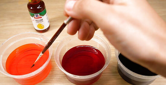 Mix together 1/4 bottle of food color with one cup of water for paint. Alternately, use poster or tube paints. Greens, reds, silvers, golds, and deep blues are considered traditional Christmas colors.