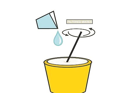 Stir in 2 to 4 tablespoons (30 to 60 mL) of filtered water. Start with 1 tablespoon (15 mL) of water. Give the mixture a stir, then wait for the fizzing to stop. The mixture should be wet enough to just hold together when squeezed in your fist. If the mixture does not do that, add the rest of the water, 1 tablespoon (15 mL) at a time. You may not end up using all of the water. Do not make the mixture too wet and soggy, or the ingredients will overreact and not work properly.