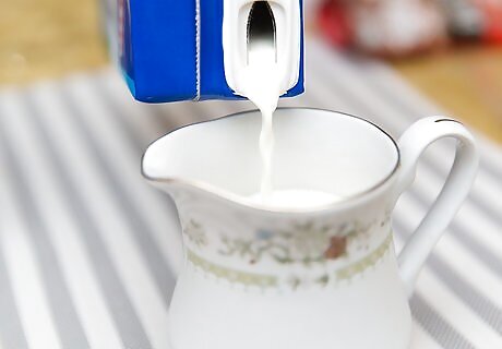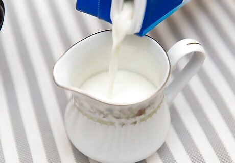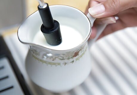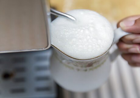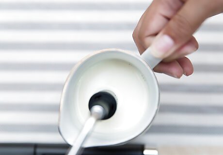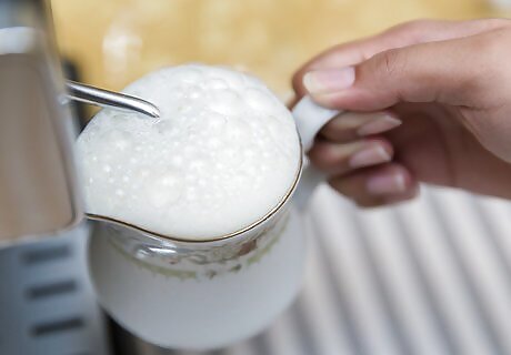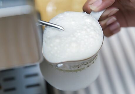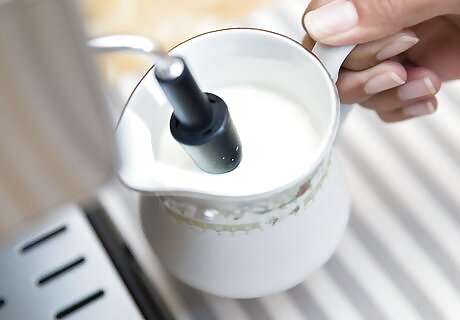 Pour 6 to 12 ounces of cold milk in a pitcher, depending on the desired size of the latte. Keep in mind that the volume of the milk will increase with steaming.
