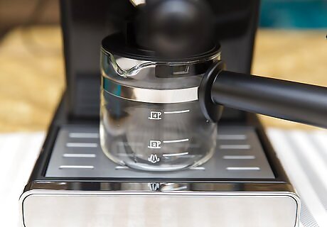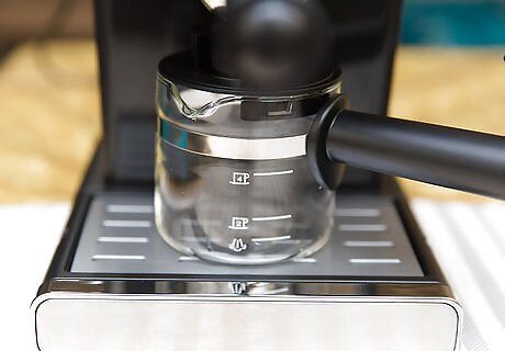 Make a shot of espresso. The perfect espresso shot depends on pressure and timing. Fill the reservoir of your machine with water. Turn the machine on. It may take some time for the water to heat Pack the portafilter full of espresso grounds, then lightly tamp them down so the surface is flat. Try to pack the beans densely so there will be significant water pressure when brewing. This will result in a stronger shot. Be careful not to pack beans so densely that water cannot get through, because this can cause back-up and overflow. Learning the best density for your machine will take some practice. Place the portafilter in the machine, and put a standard espresso cup under the portafilter spout. Set the water to "espresso" or "caffe" and turn it on to brew your espresso shot. A single shot should create one to two ounces.