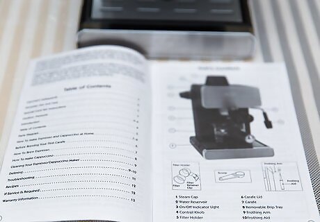 Get to know your espresso machine. Before you begin, look at the manual for your machine and get a sense of where everything is. Not all espresso machines are alike, but they will all have the same basic parts: The portafilter, where espresso grounds are placed for brewing. A hot water knob or button, which turns on the hot water and sends it through the portafilter to make a shot. An espresso or steam switch that designates whether water should go through the portafilter or the steam wand. On Italian machines, this may be marked with the words "caffe" and "vapore". The steam wand, which is used to steam milk. The steam knob, which controls the amount of steam released from the steam wand. A grinder, which produces the ultra fine grounds that give espresso its uniquely strong flavor. Most experts agree that owning an espresso grinder is a necessity for home baristas, so if your machine doesn't come with a grinder you should consider buying one.