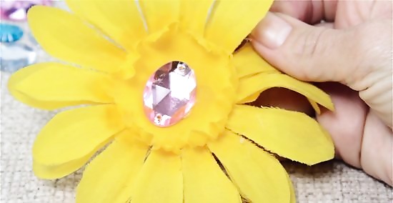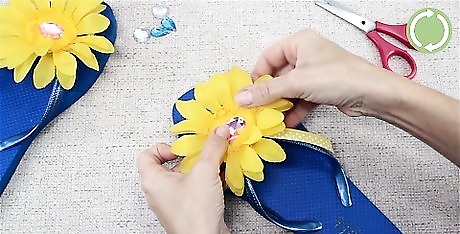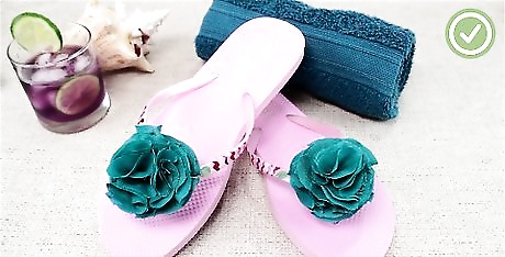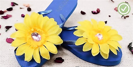 Add a fake jewel with hot glue in the center of the flower for some bling. Not all flower flip flops have jewels on them, but if you’d like yours to shine a little more, use hot glue to attach a fake jewel to the center of your flower. Place a pea-sized dot of hot glue into the center of your flower and hold the jewel onto the glue for about 10 seconds. You can find fake jewels at most craft supply stores.