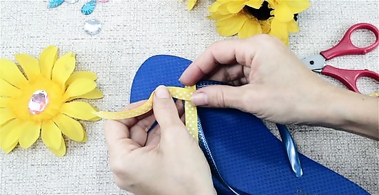 Glue a strand of ribbon under your flower for some added flair. If you’d like to decorate your flip flops even more, use a 6 in (15 cm) strand of ribbon that goes with the color of your flower and your flip flops. Fold it over itself in the center so that your ribbon hangs loose on both sides of the flip flop. Use hot glue to stick the ribbon onto your flip flop where you want to put your flower. Use a patterned ribbon to draw more attention to it.