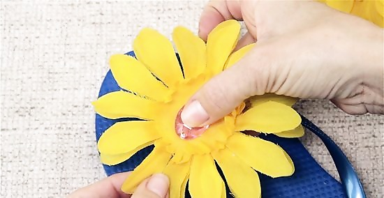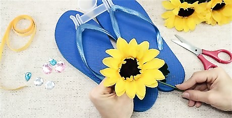 Cut the stem and backing off of a silk fake flower. Choose a fake flower that goes well with the color of your flip flops. Fake flowers have a plastic stem held on by a plastic backing. Cut and remove the plastic parts from the flower. If your flower has a plastic center, take that out too.