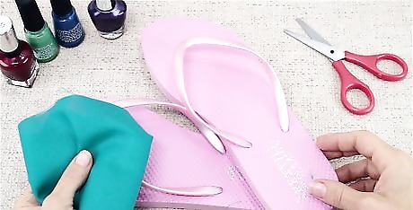 Pick out cotton fabric that matches your flip flops. The cotton fabric will be the stand-out element on your flip flops. Choose some fabric that goes well with the color of your shoes - orange with yellow, black with white, or blue with purple. You can even used pattern fabric, like tie-dye. You can buy cotton fabric at most craft stores.