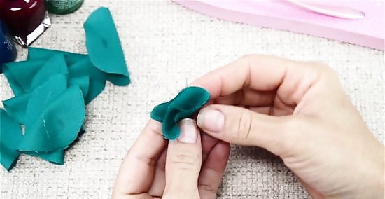 Place the cotton pieces on the felt in a spiral and glue them down. Place a pea-sized dot of glue in the center of your fabric circle. Set the pointed end of 1 cotton circle onto the glue. Work outward in a spiral pattern to glue all 20 of the cotton circles onto the felt. Keep them close together so they create a full flower shape. Depending on the size of your felt circle, you might not be able to fit all of your cotton onto it. If you have any leftovers, use them for your second flip flop.
