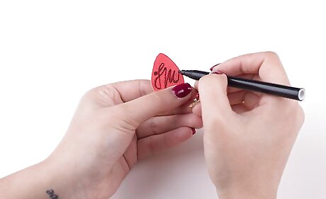 Copy the design of a particular brand you love. Everyone has their own brand loyalty for a specific guitar company, whether it's Dunlop, Gibson, or Fender. Look up the logo of your favorite brand and carefully duplicate it onto your homemade pick to showcase your style.