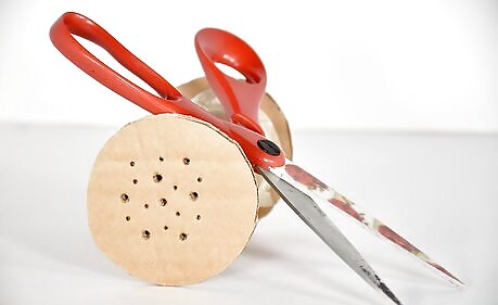 Punch small holes in the top and bottom of the tube. Using a pair of scissors, and awl, or even a sharp pencil, make small holes in the cardboard circles you taped onto the tube. It's important not to make the holes too big as your kitten will make the holes bigger with its teeth. These holes are also important because they allow your kitten to smell the contents of the toy.