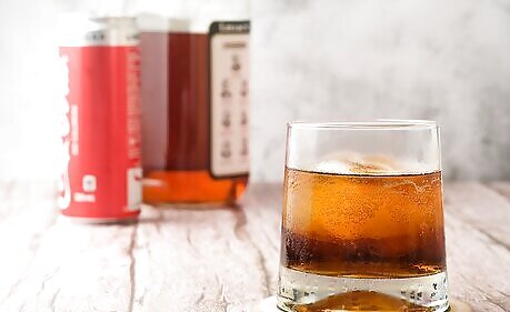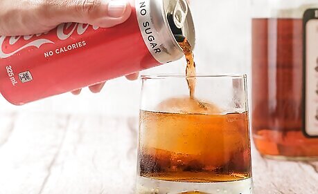 Try a whiskey and diet cola. A traditional whiskey and cola runs high in carbohydrates. For a simple replacement that's lower in calories, mix 1 shot (1.5 ounces) of whiskey with about 4 1/2 ounces of diet cola. Pour the drink over ice and enjoy it immediately. An even better replacement for the high carb whiskey and cola is just whiskey on the rocks. This cuts out all of the sugar that comes with the soda or diet cola.
