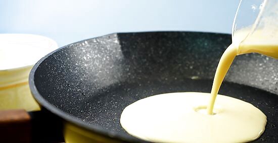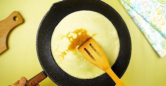 Pour about 1/4-1/3 cup of batter into the pan (larger amount for larger diameter pan). Tilt the pan in a circular motion to help spread the batter.