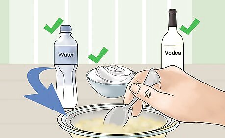 Add the vodka, cream, and remaining water. Pour your vodka and cream into the mixture. Then, add the remaining quarter cup (60 mL) of water. Stir the mixture using a spoon until all the ingredients are evenly mixed.