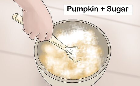 Mix in the pumpkin and sugar. While you stir, pour in your pumpkin and sugar. Keep stirring until all the ingredients are evenly mixed.