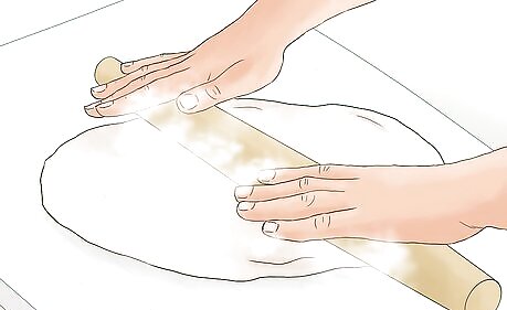 Unroll the dough on a flat surface. Remove the case of the pie rolls. On a flat, clean surface, such as a baking tray or cutting board, slowly unroll the dough so it lies flat on the surface. Set down parchment paper or sprinkle flower on the surface beforehand to prevent the dough from sticking.