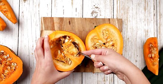 Scoop out the seeds. Use a large spoon to scoop all of the pumpkin seeds from the halves into a bowl. Save the seeds for later, since they're delicious roasted. Scoop out as many of the orange strings as you can, too.